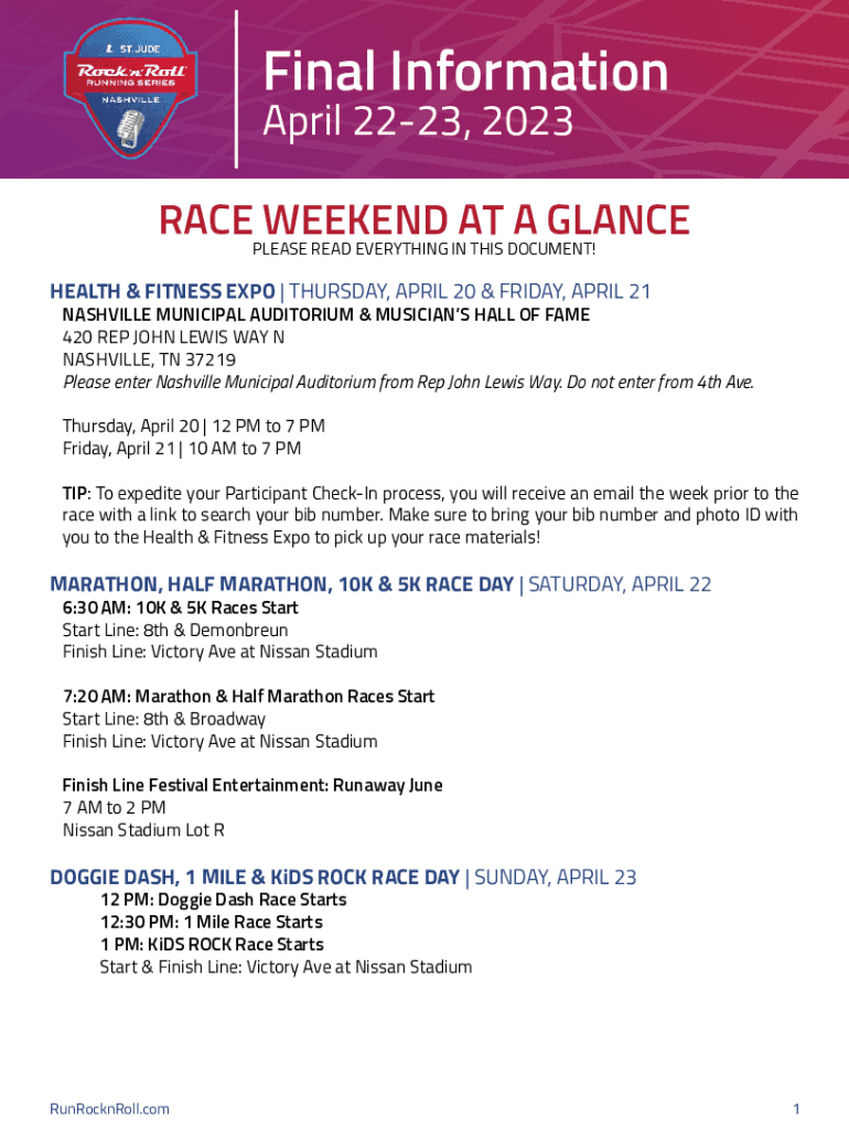 Final Information April 2223, 2023RACE WEEKEND AT A GLANCE PLEASE READ EVERYTHING IN THIS DOCUMENT!HEALTH & FITNESS EXPO | THURSDAY, APRIL 20 & FRIDAY, APRIL 21NASHVILLE MUNICIPAL AUDITORIUM & MUSICIANS