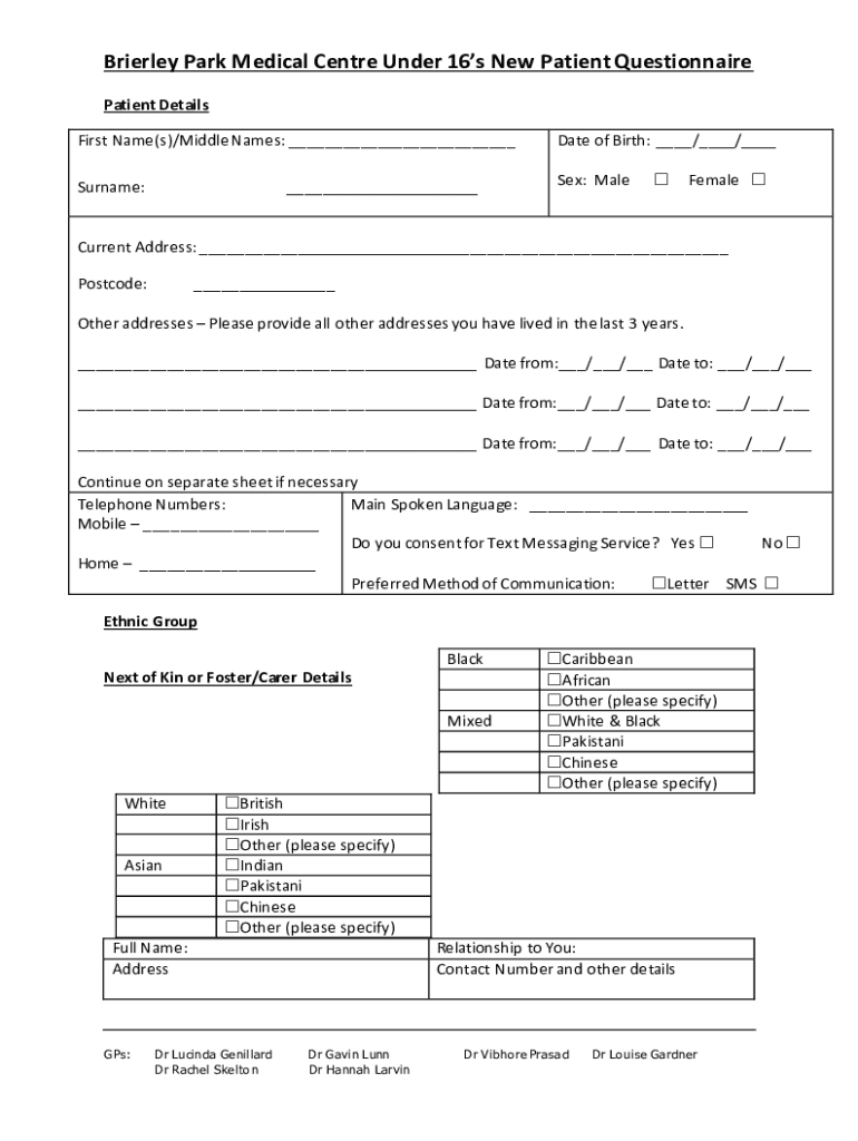 Briefly Park Medical Center Under 16s New Patient Questionnaire Patient Details First Name(s)/Middle Names: ___Date of Birth: ___/___/___Surname:Sex: Male___Female Current Address: ___ Postcode:___Other