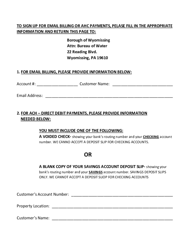 TO SIGN UP FOR EMAIL BILLING OR AHC PAYMENTS, PEL ASE FILL IN THE APPROPRIATE INFORMATION AND RETURN THIS PAGE TO: Borough of Wyo missing Attn: Bureau of Water 22 Reading Blvd. Wyo missing, PA 19610