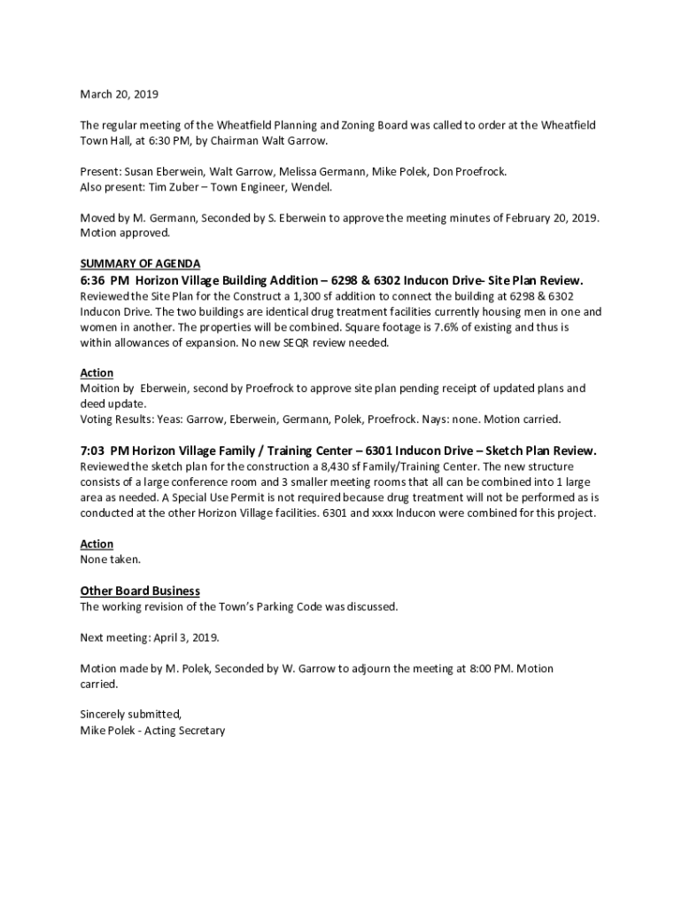 March 20, 2019, The regular meeting of the Wheat field Planning and Zoning Board was called to order at the Wheat field Town Hall, at 6:30 PM, by Chairman Walt Narrow. Present: Susan Iberian, Walt