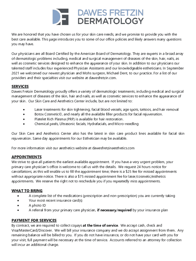 We are honored that you have chosen us for your skin care needs, and we promise to provide you with the best care available. This page introduces you to some of our office policies and likely answers