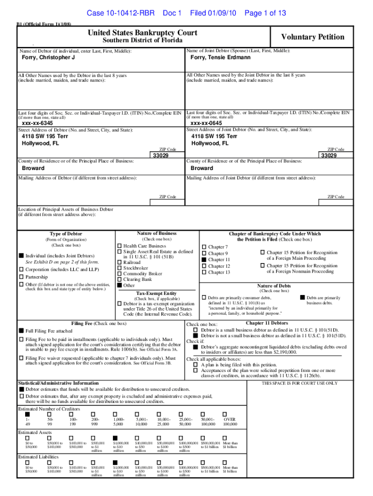 Case 1010412RBRDoc 1Filed 01/09/10Page 1 of 13B1 (Official Form 1)(1/08)United States Bankruptcy CourtVoluntary PetitionSouthern District of Florida b k 1 F o r m. V l u n t a y P e name of Joint