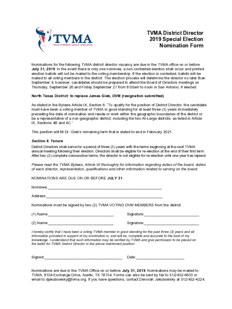 VMA District Director 2019 Special Election Nomination FormNominations for the following VMA district director vacancy are due in the VMA office on or before July 31, 2019. In the event there is only
