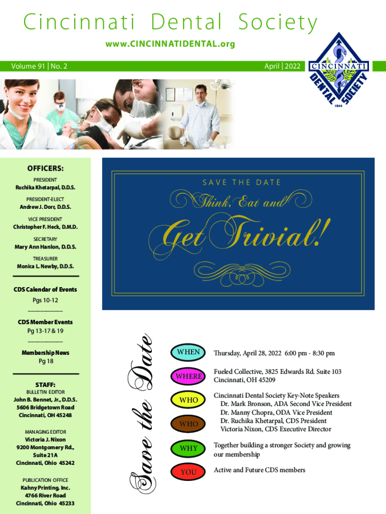 C inc in n a TID e n ta l S o c i e t y www.CINCINNATIDENTAL.org Volume 91 | No. 2April | 2022OFFICERS: PRESIDENTS AVE THE DATERuchika Khetarpal, D.D.S.think, Eat and think, Eat and SAVE THE DATEPRESIDENTELECTAndrew