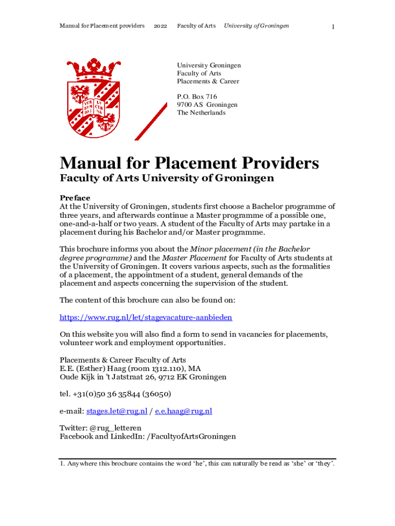 Manual for Placement providers2022Faculty of Pre-university of Groningen1University Groningen Faculty of Arts Placements & Career P.O. Box 716 9700 AS Groningen The NetherlandsManual for Placement