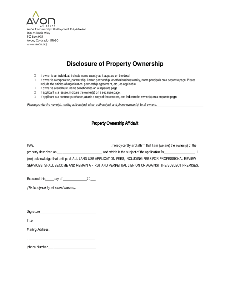 Avon Community Development Department 100 Mikaela Way PO Box 975 Avon, Colorado 81620 www.avon.orgDisclosure of Property Ownership If owner is an individual; indicate name exactly as it appears on