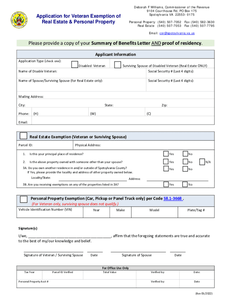 Application and Instructions for Veteran Exemption of Real Estate & Personal Property Deborah F Williams, Commissioner of the Revenue 9104 Courthouse Rd, PO Box 175 Spotsylvania VA 22553 0175 Personal