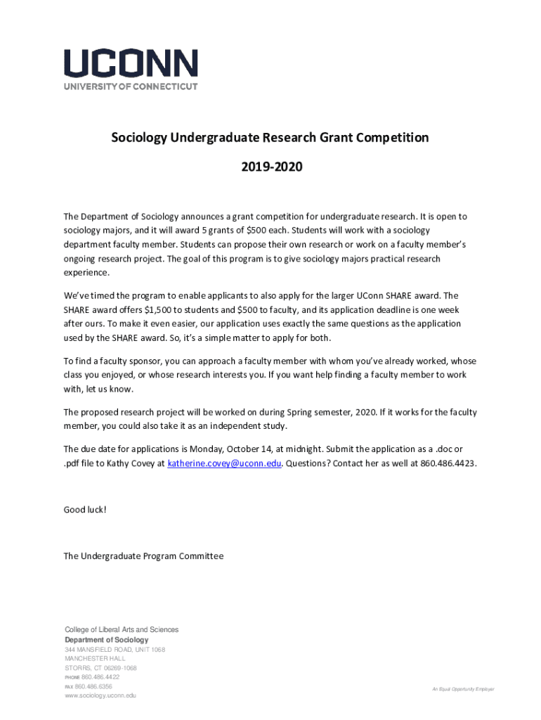 Sociology Undergraduate Research Grant Competition 20192020The Department of Sociology announces a grant competition for undergraduate research. It is open to sociology majors, and it will award 5