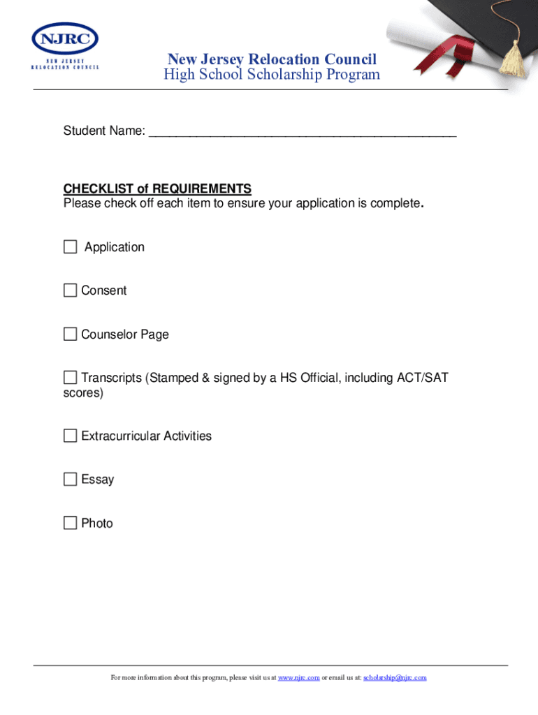 New Jersey Relocation Council High School Scholarship ProgramStudent Name: ___CHECKLIST of REQUIREMENTS Please check off each item to ensure your application is complete. ApplicationConsentCounselor