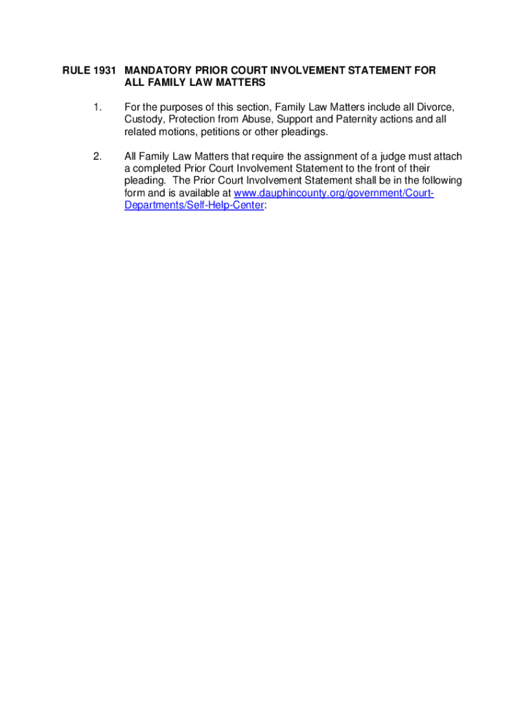 RULE 1931 MANDATORY PRIOR COURT INVOLVEMENT STATEMENT FOR ALL FAMILY LAW MATTERS 1. For the purposes of this section, Family Law Matters include all Divorce, Custody, Protection from Abuse, Support