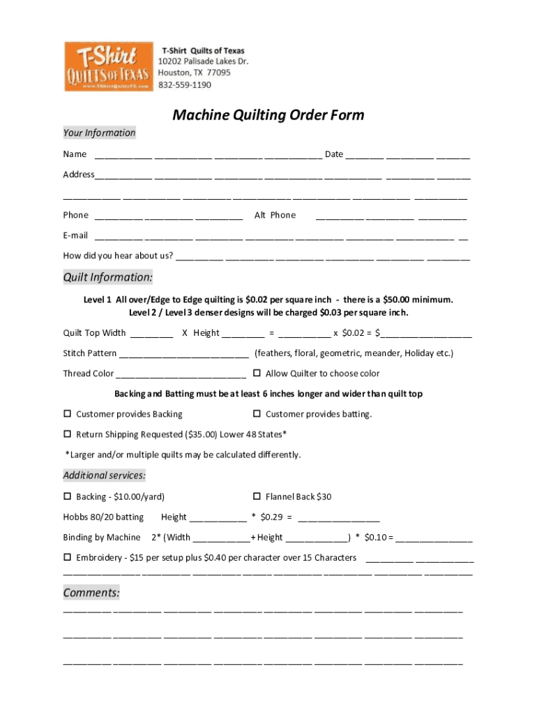 Machine Quilting Order Form Your Information Name ___ ___ ___ ___ Date ___ ___ ___ Address___ ___ ___ ___ ___ ___ ___ ___ ___ ___ ___ ___ ___ ___ Phone ___ ___ ___Alt Phone___ ___ ___Email ___ ___
