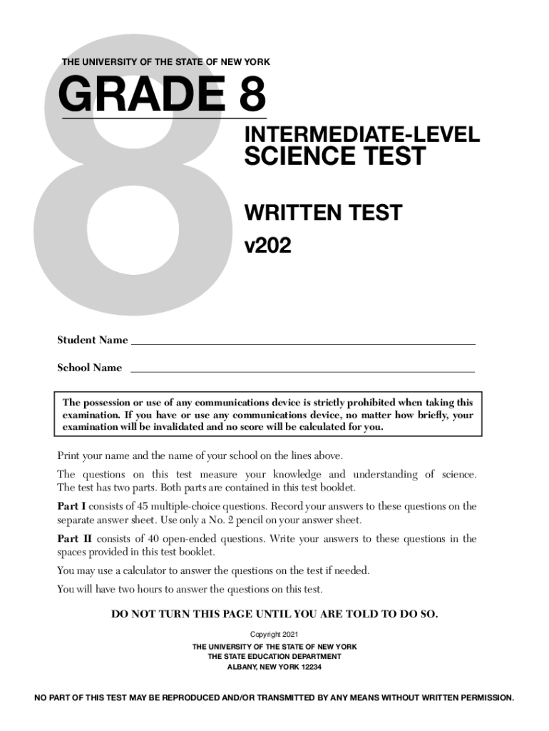 8THE UNIVERSITY OF THE STATE OF NEW DOWNGRADE 8 INTERMEDIATELEVELSCIENCE TEST WRITTEN TEST v202Student Name ___ School Name ___ The possession or use of any communications' device is strictly prohibited