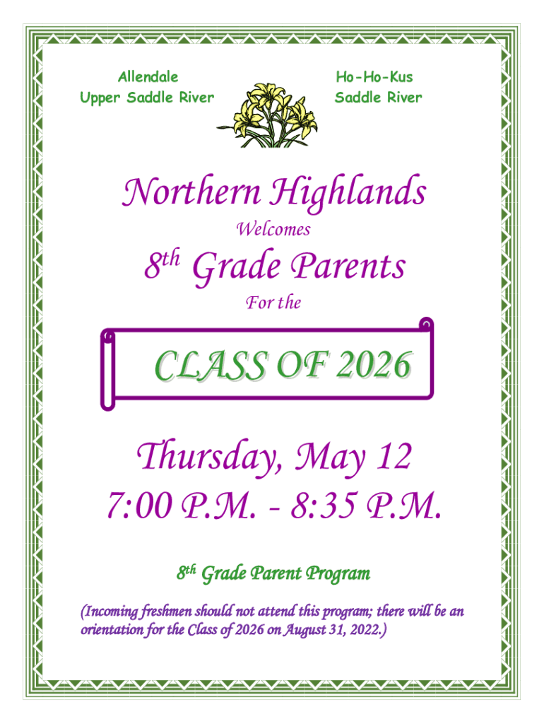 Allendale Upper Saddle RiverHoHoKus Saddle RiverNorthern Highlands Welcomes8th Grade Parents For class OF 2026 Thursday, May 12 7:00 P.M. 8:35 P.M. 8th Grade Parent Program (Incoming freshmen should