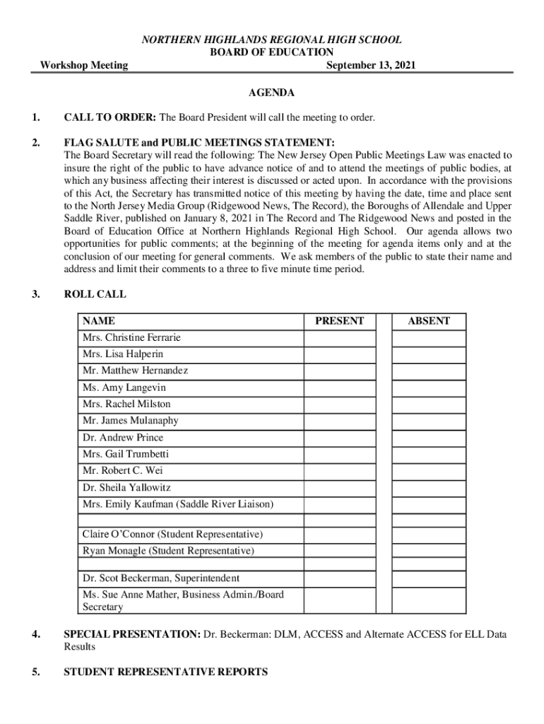 Workshop MeetingNORTHERN HIGHLANDS REGIONAL HIGH SCHOOL BOARD OF EDUCATION September 13, 2021 AGENDA1.CALL TO ORDER: The Board President will call the meeting to order.2.FLAG SALUTE and PUBLIC MEETINGS