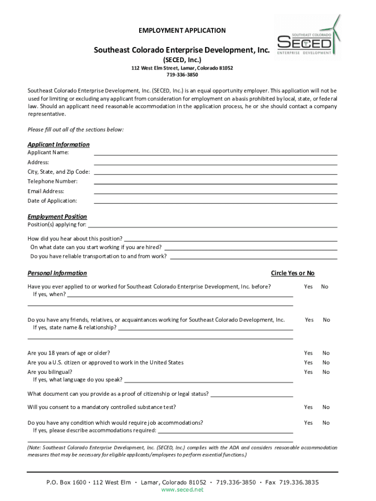 EMPLOYMENT APPLICATION Southeast Colorado Enterprise Development, Inc. (SEED, Inc.) 112 West Elm Street, Lamar, Colorado 81052 7193363850Southeast Colorado Enterprise Development, Inc. (SEED, Inc.)