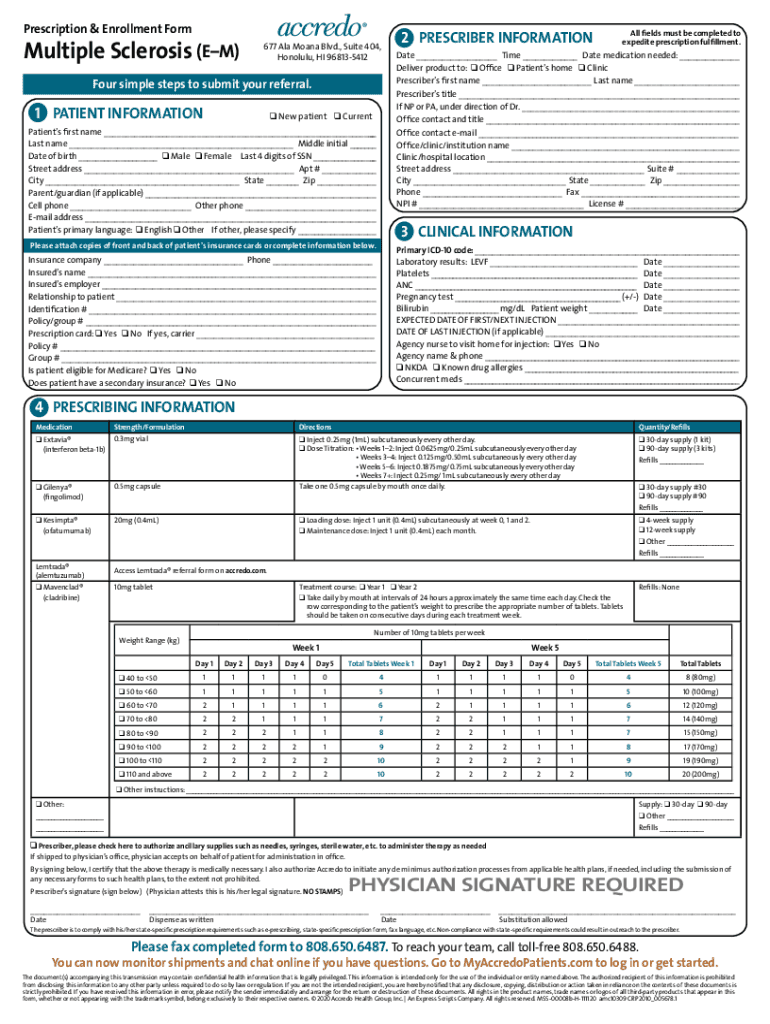 Prescription & Enrollment FormMultiple Sclerosis (EM)677 Ala Mona Blvd., Suite 404, Honolulu, HI 968135412Four simple steps to submit your referral.1 PATIENT INFORMATION New patient CurrentPatients