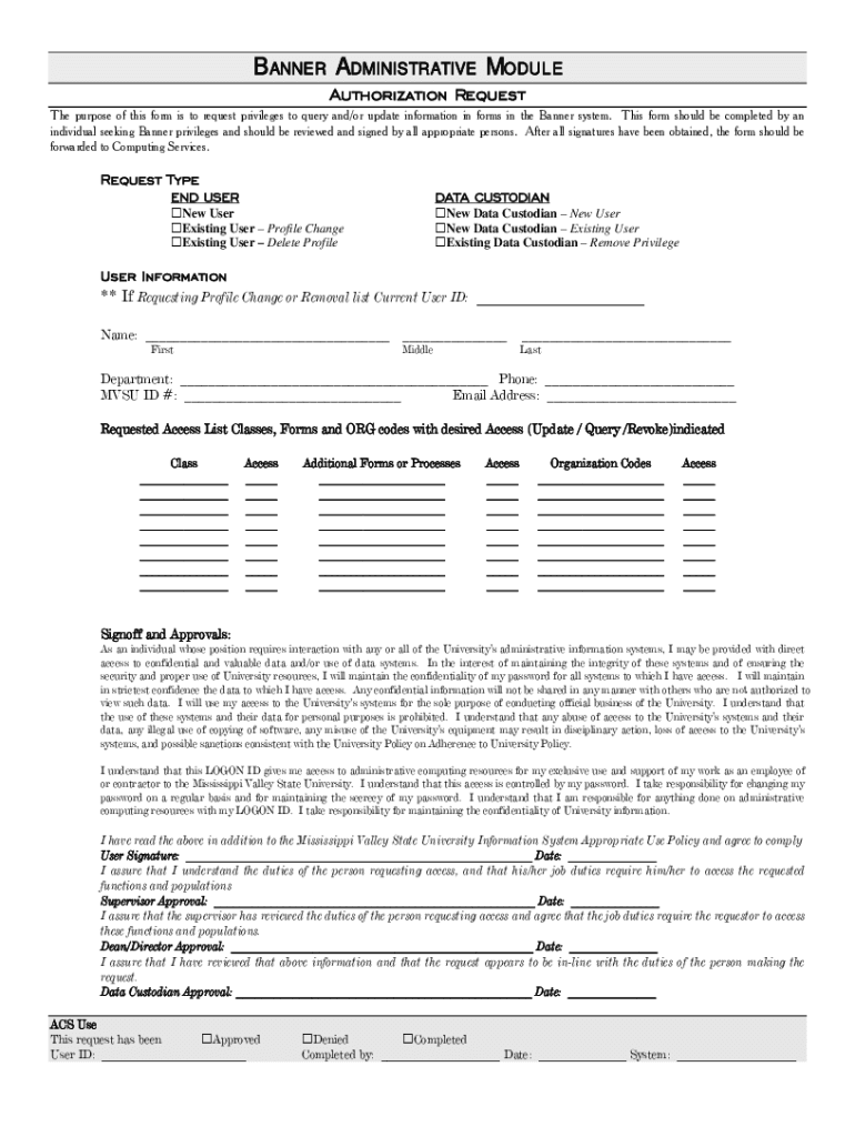 Clear Forerunner Administrative Module Authorization Request The purpose of this form is to request privileges to query and/or update information in forms in the Banner system. This form should be