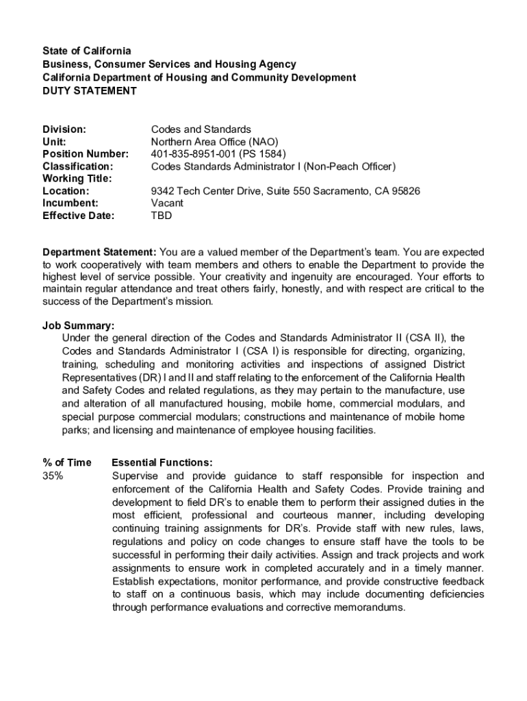 State of California Business, Consumer Services and Housing Agency California Department of Housing and Community Development DUTY STATEMENT Division: Unit: Position Number: Classification: Working