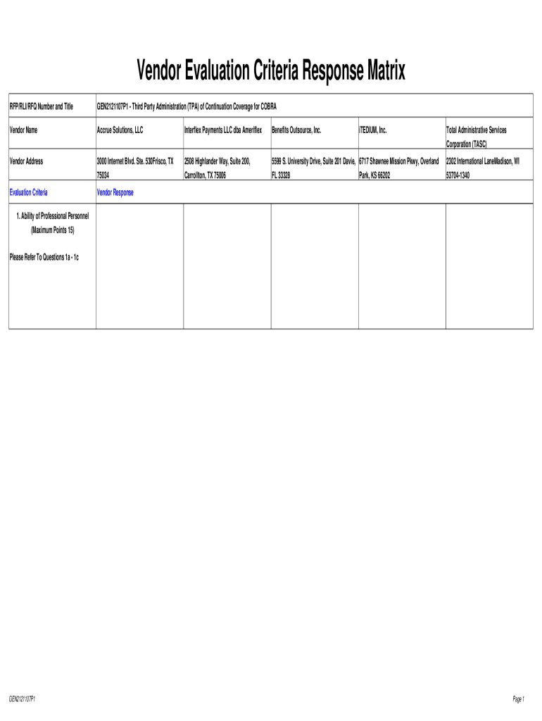 Vendor Evaluation Criteria Response Matrix RFP/RLI/RFQ Number and TitleGEN2121107P1 Third Party Administration (TPA) of Continuation Coverage for COBRAVendor NameAccrue Solutions, LLCInterflex Payments