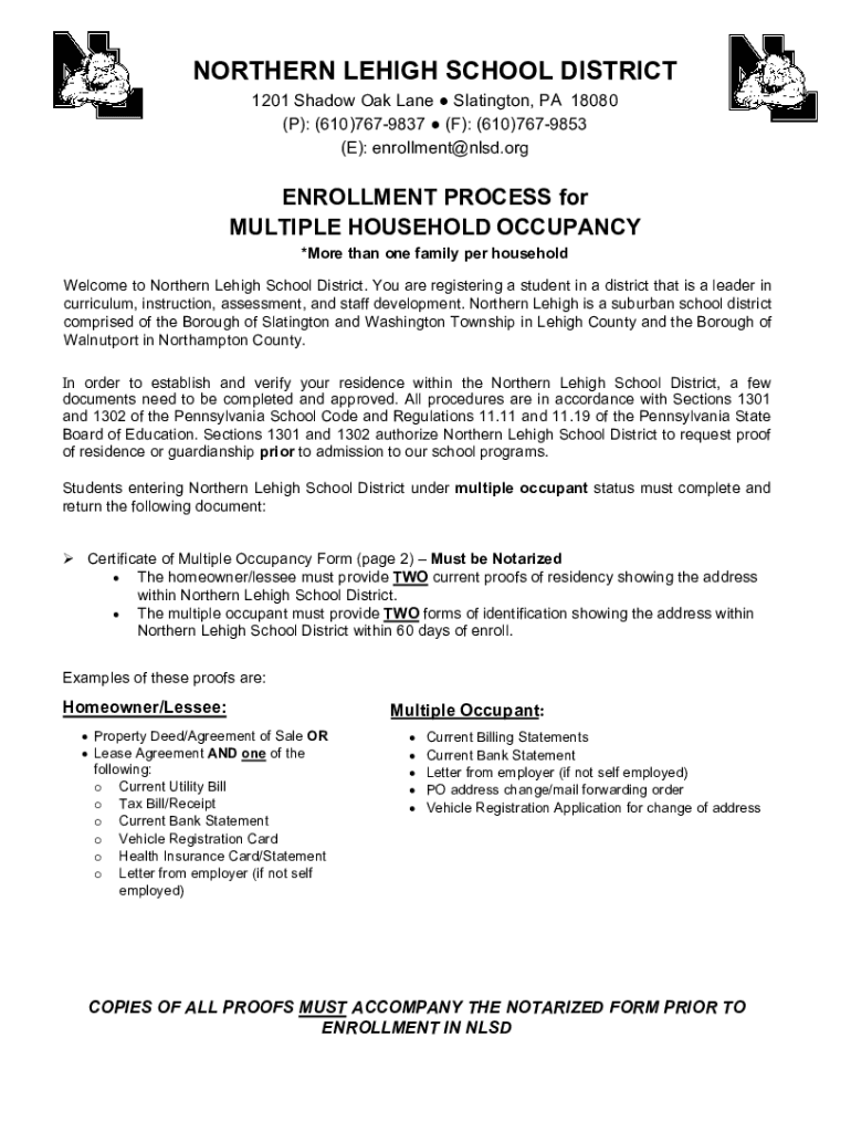 NORTHERN LEIGH SCHOOL DISTRICT 1201 Shadow Oak Lane Slating ton, PA 18080 (P): (610)7679837 (F): (610)7679853 (E): enrollment@nlsd.orgENROLLMENT PROCESS for MULTIPLE HOUSEHOLD OCCUPANCY *More than