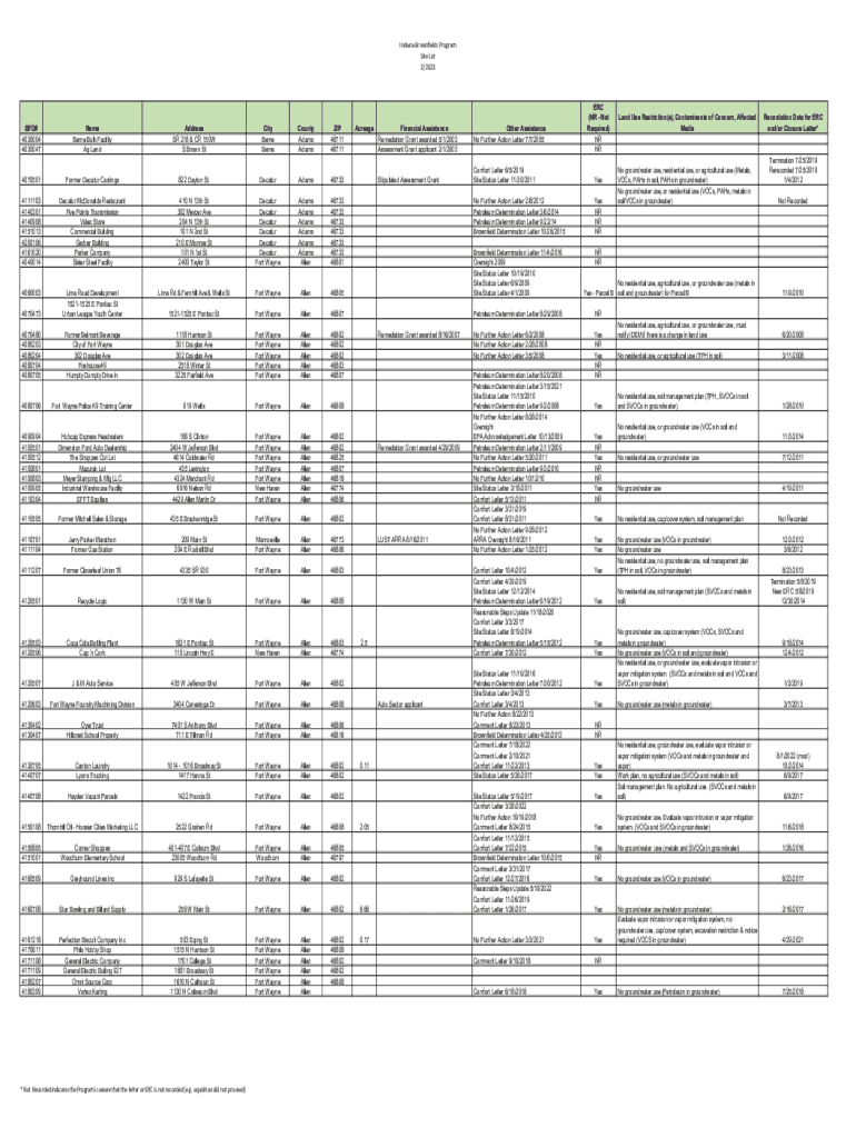 Indiana Brownfield Program Site List 2/2023BFD# 4030004 4030047Name Borne Bulk Facility Ag LandAddress SR 218 & CR 150W S Brown City Borne Bergen County Adams ZIP 46711 467114070501Former Decatur