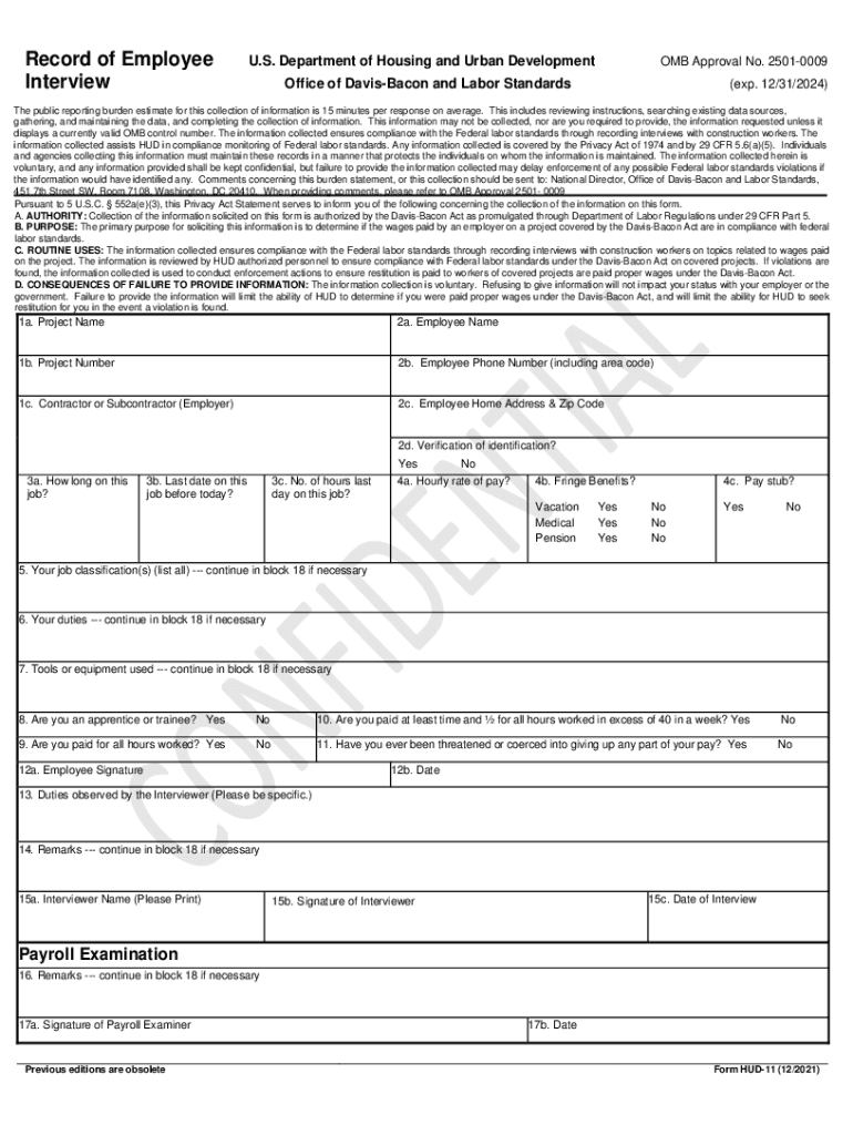 Record of Employee Interview. S. Department of Housing and Urban Development OMB Approval No. 25010009Office of Davis Bacon and Labor Standards(exp. 12/31/2024)The public reporting burden estimate