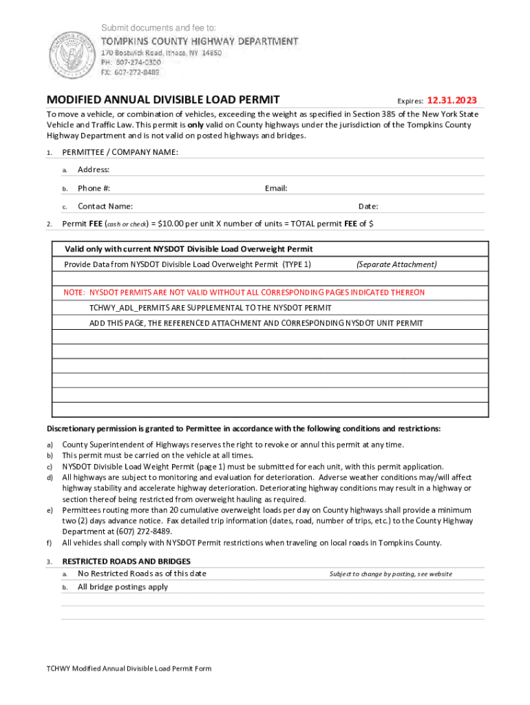 Submit documents and fee to:Expires:12.31.2023MODIFIEDANNUALDIVISIBLELOADPERMITTomoveavehicle,orcombinationofvehicles,exceedingtheweightasspecifiedinSection385oftheNewYorkState