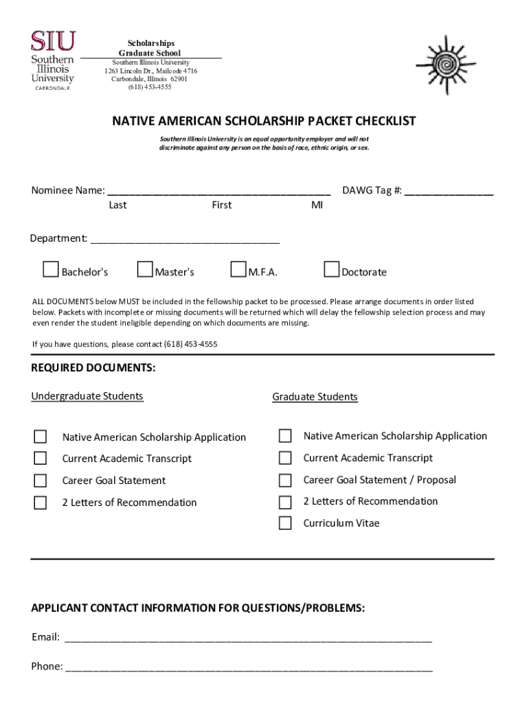 Get the free NATIVE AMERICAN SCHOLARSHIP PACKET CHECKLIST - gradschool siu