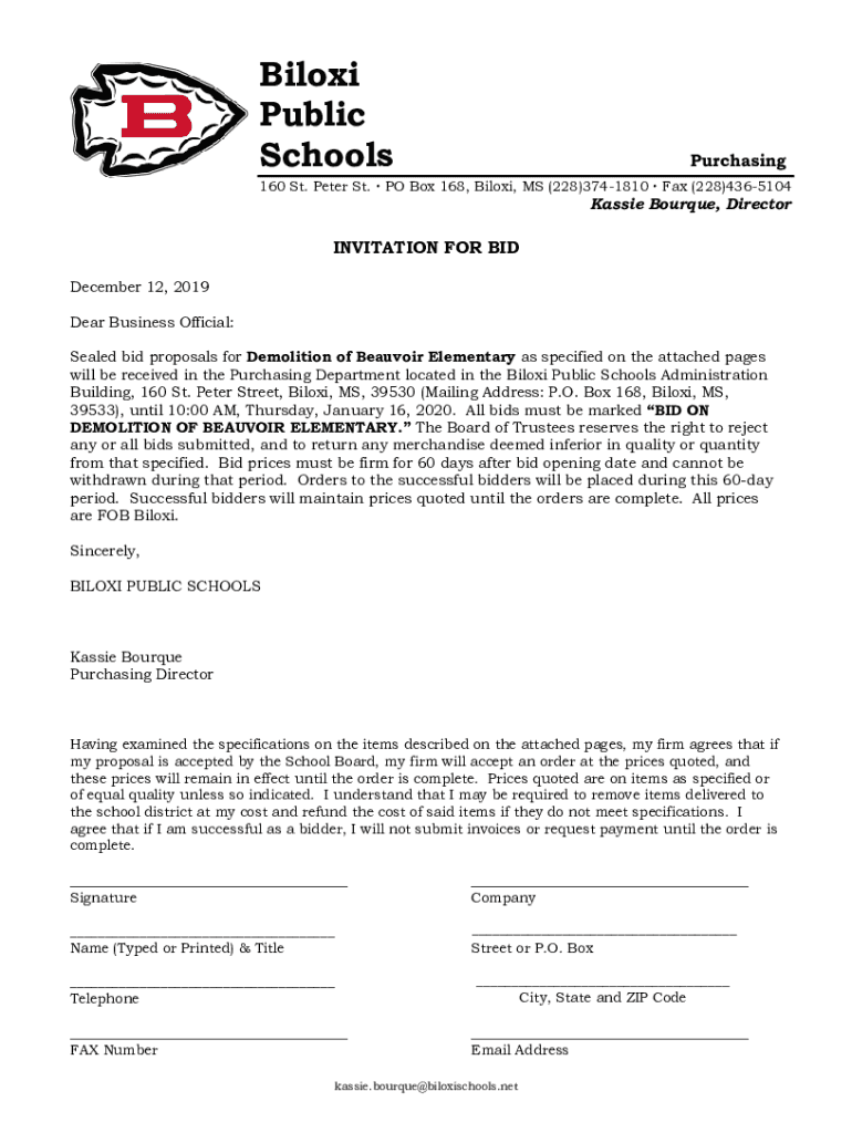 Biloxi Public SchoolsPurchasing160 St. Peter St. PO Box 168, Biloxi, MS (228)3741810 Fax (228)4365104Kassie Torque, DirectorINVITATION FOR BID December 12, 2019, Dear Business Official: Sealed bid