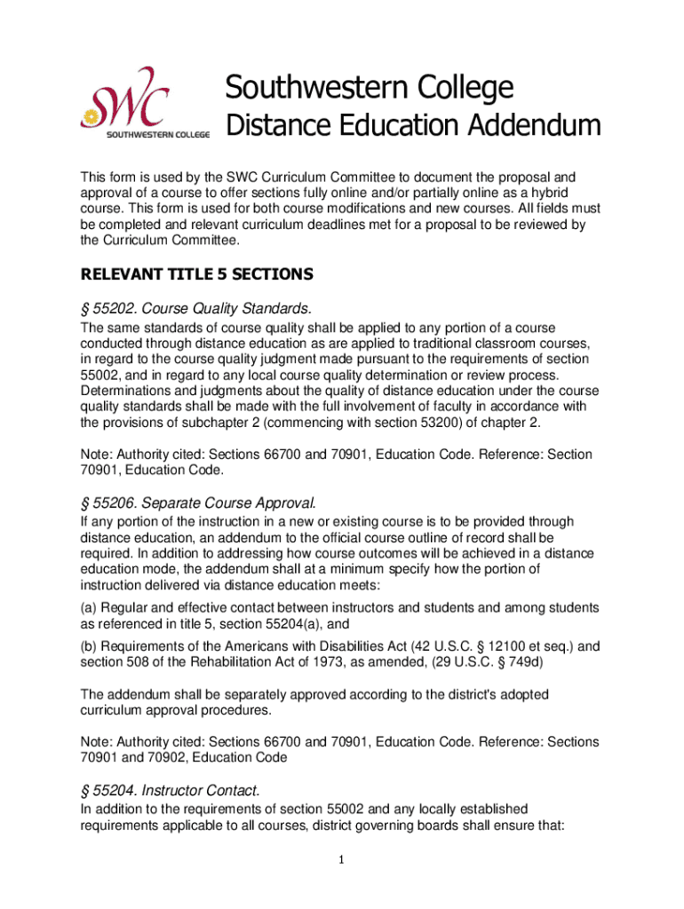 Southwestern CollegeDistance Education Addendum This form is used by the SIC Curriculum Committee to document the proposal and approval of a course to offer sections fully online and/or partially