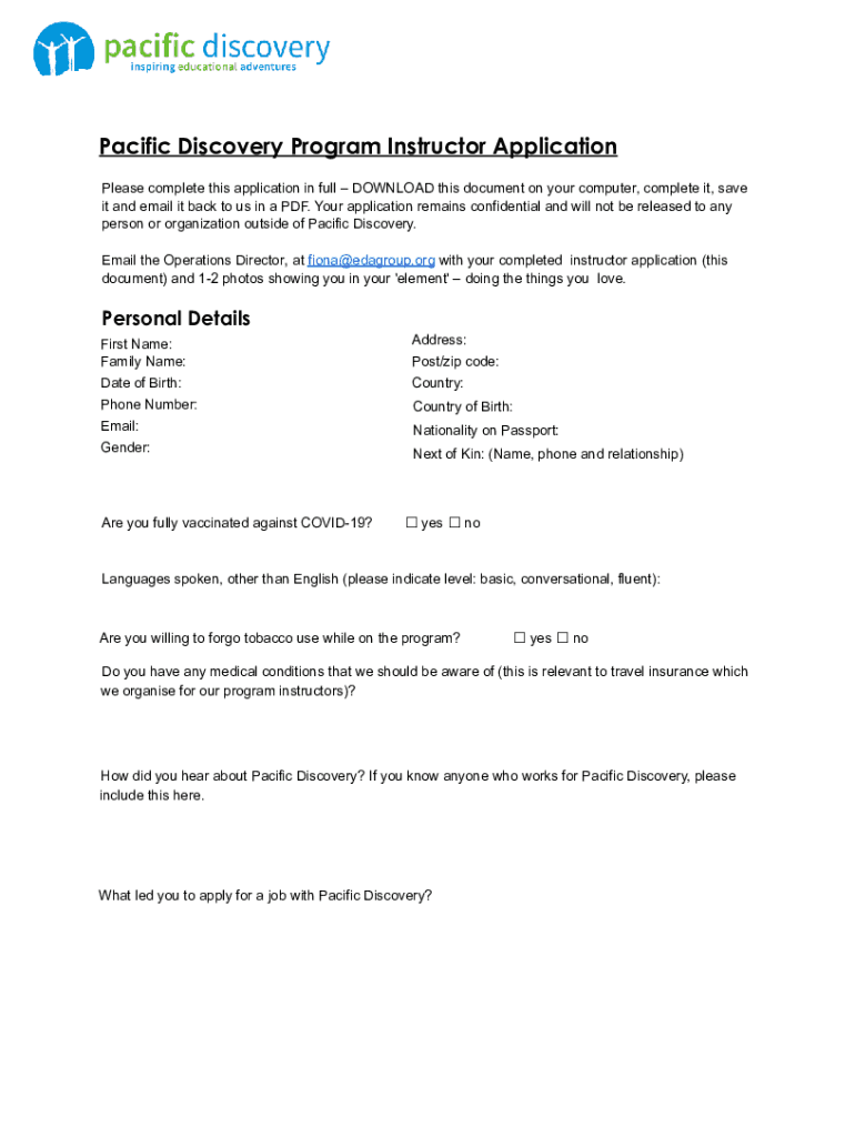 Pacific Discovery Program Instructor Application Please complete this application in full DOWNLOAD this document on your computer, complete it, save it and email it back to us in a PDF. Your application