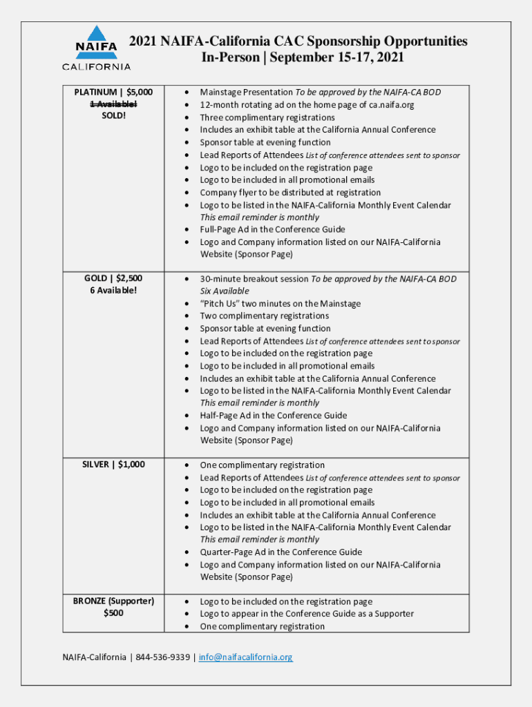 2021 NAIFACalifornia CAC Sponsorship Opportunities Unperson | September 1517, 2021 PLATINUM | $5,000 1 Available! SOLD! GOLD | $2,500 6 Available! SILVER | $1,000 BRONZE (Supporter) $500 Main stage