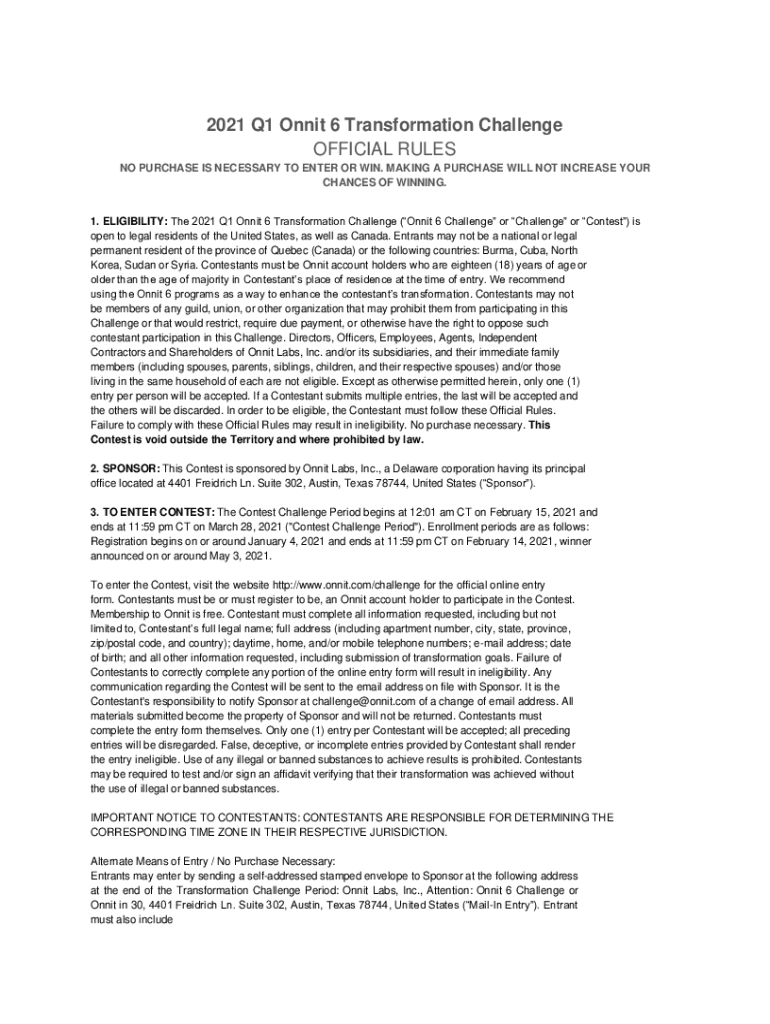 2021 Q1 Innit 6 Transformation Challenge OFFICIAL RULES NO PURCHASE IS NECESSARY TO ENTER OR WIN. MAKING A PURCHASE WILL NOT INCREASE YOUR CHANCES OF WINNING. 1. ELIGIBILITY: The 2021 Q1 Innit 6 Transformation