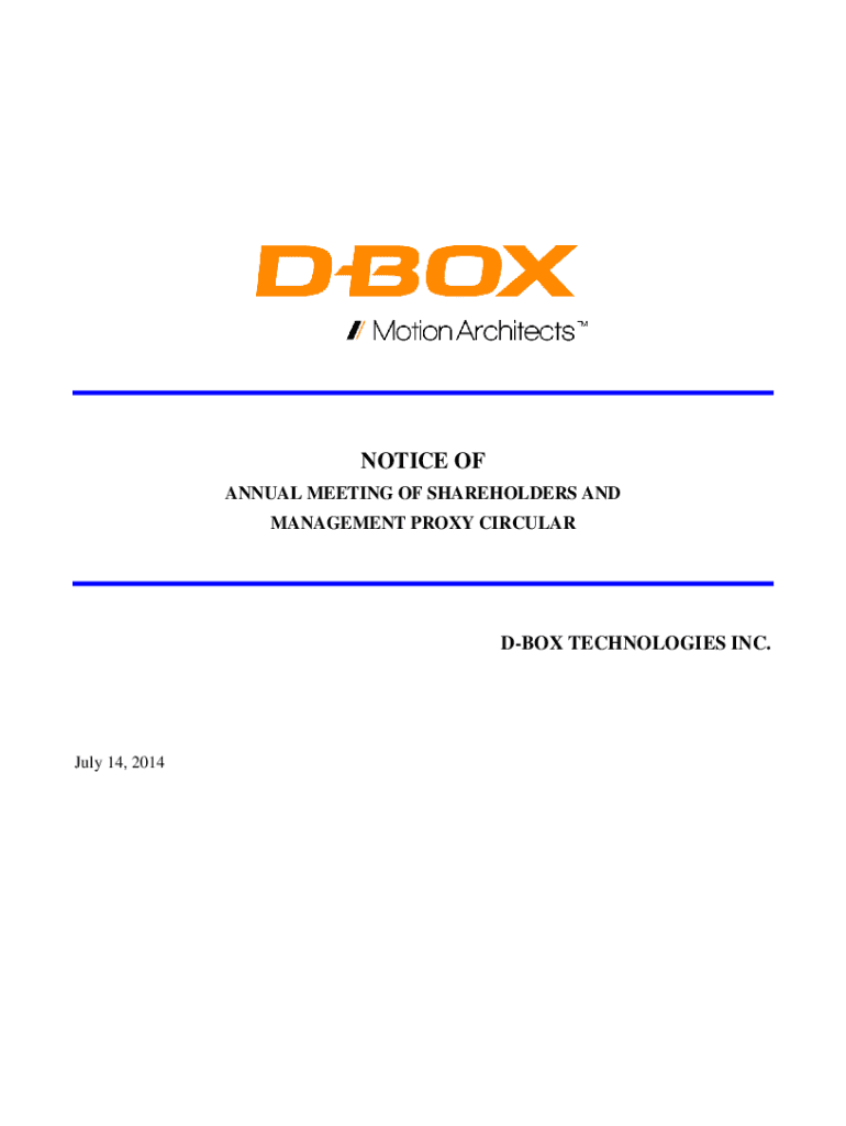 NOTICE OF ANNUAL MEETING OF SHAREHOLDERS AND MANAGEMENT PROXY CIRCULARDBOX TECHNOLOGIES INC. July 14, 2014DBOX TECHNOLOGIES INC. NOTICE OF ANNUAL MEETING OF SHAREHOLDERS TAKE NOTICE that an Annual