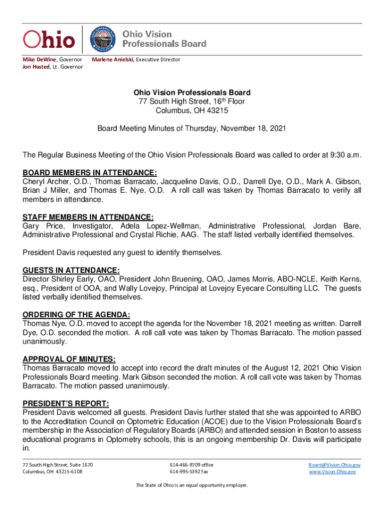 Mike DeWine, Governor Jon Hosted, Lt. Governor Marlene Angels, Executive Director Ohio Vision Professionals Board 77 South High Street, 16th Floor Columbus, OH 43215 Board Meeting Minutes of Thursday,