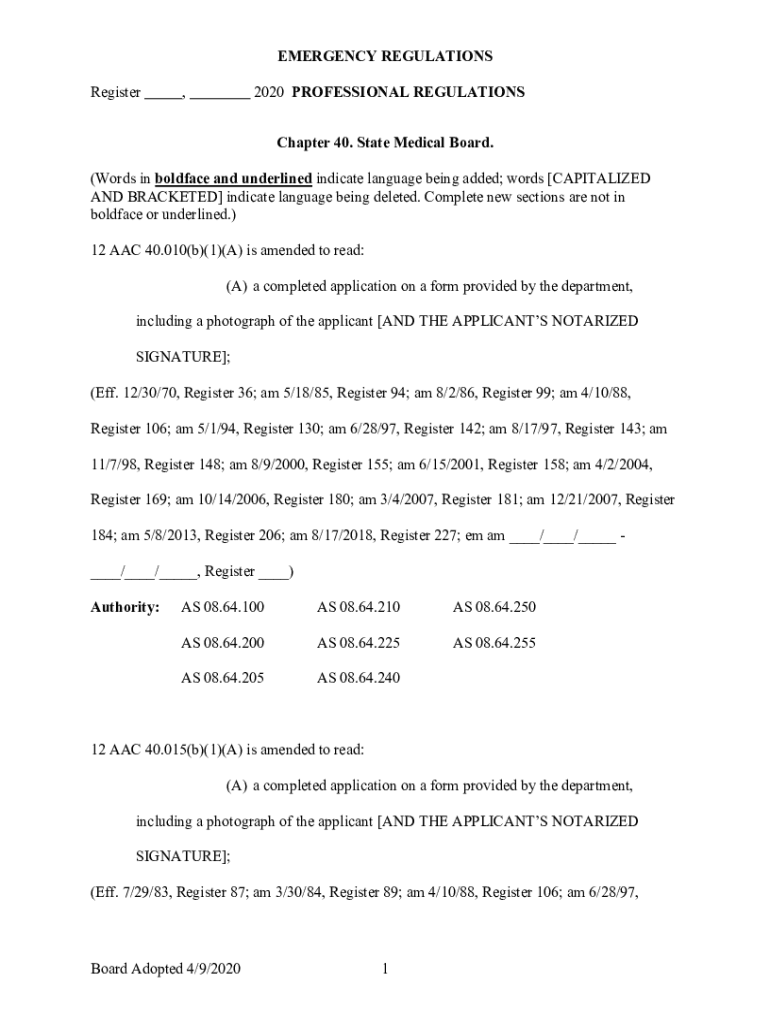 EMERGENCY REGULATIONS Register2020 PROFESSIONAL REGULATIONS, Chapter 40. State Medical Board. (Words in boldface and underlined indicate language being added; words [CAPITALIZED AND BRACKETED] indicate