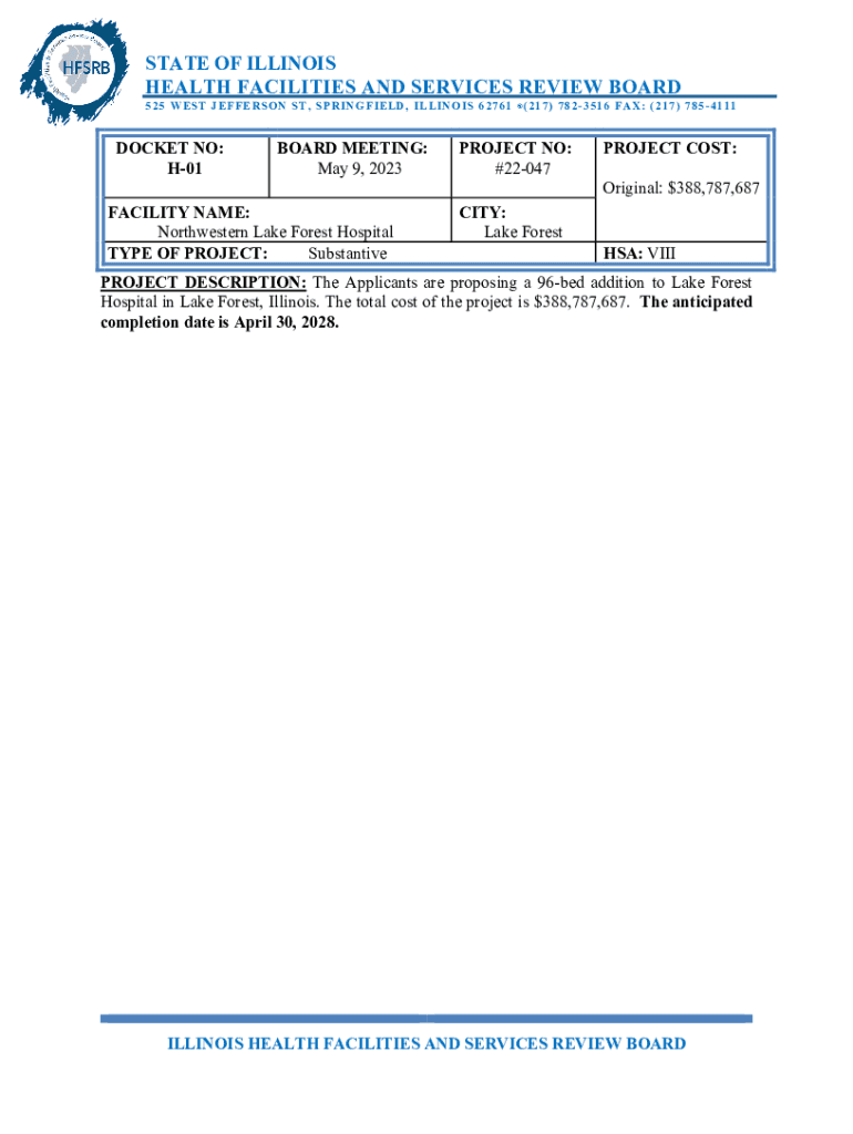 STATE OF ILLINOIS HEALTH FACILITIES AND SERVICES REVIEW BOARD5 2 5 W E S T J E F F E R S O N S T, S P R I NG F I E L D, I L L I NO I S 62 7 6 1 (2 1 7) 7 8 2 3 5 1 6 F A X : (2 1 7) 7 8 5 4 1 1 1DOCKET