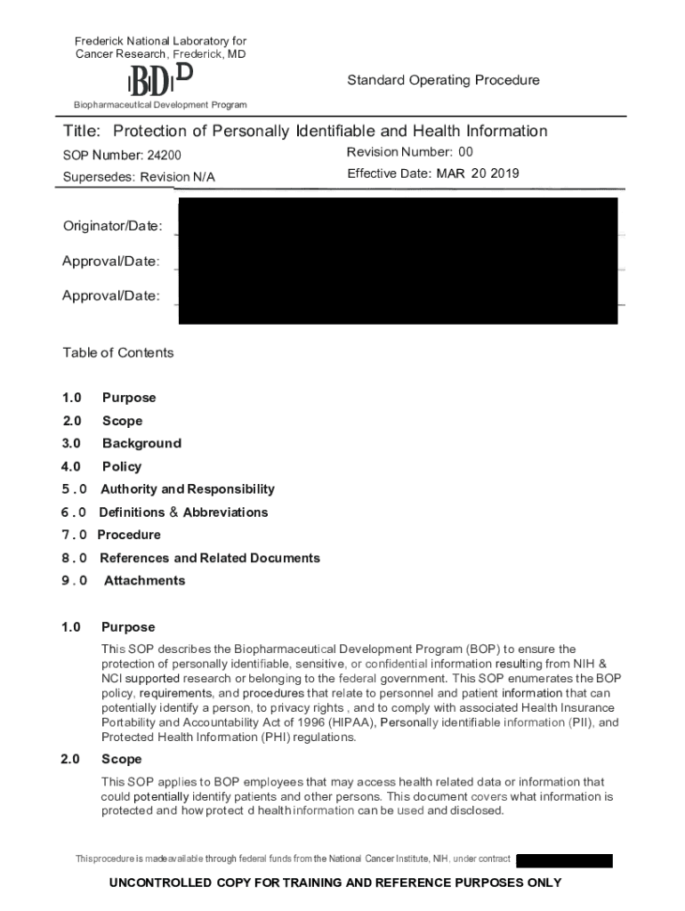 Frederick National Laboratory for Cancer Research, Frederick, DBD DI I Standard Operating ProcedureBiopharmaceutlcal Development Programmable: Protection of Personally Identifiable and Health Information