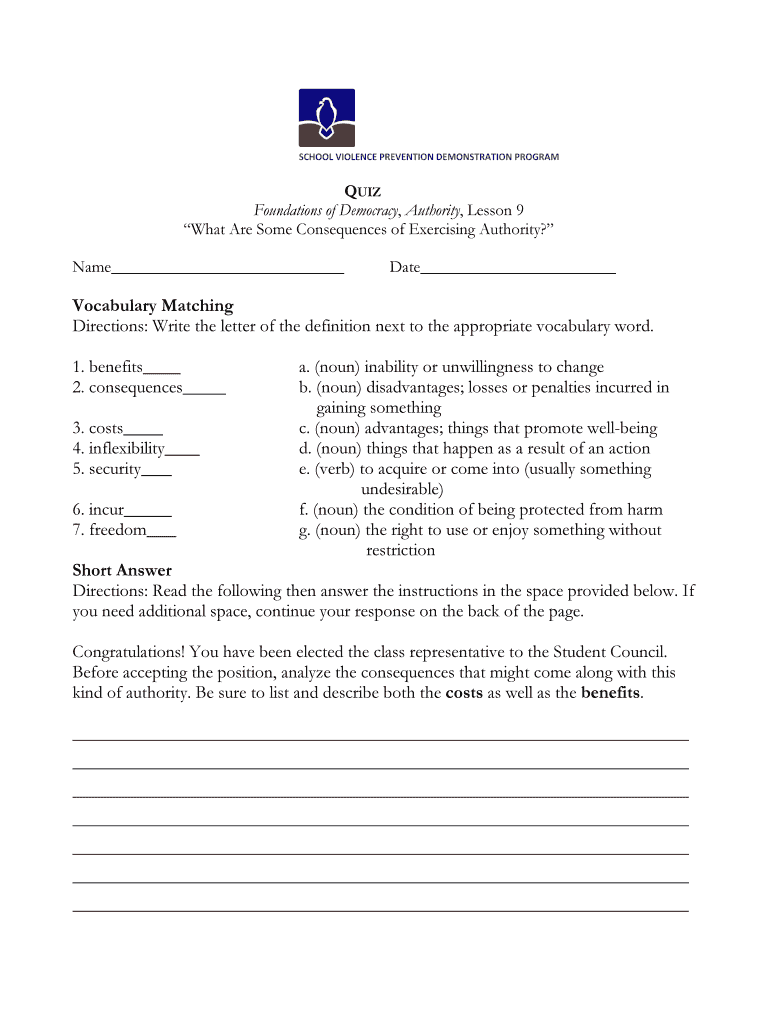 SCHOOL VIOLENCE PREVENTION DEMONSTRATION PROGRAM QUIZ Foundations of Democracy, Authority, Lesson 9 What Are Some Consequences of Exercising Authority? Name Date Vocabulary Matching Directions: Write