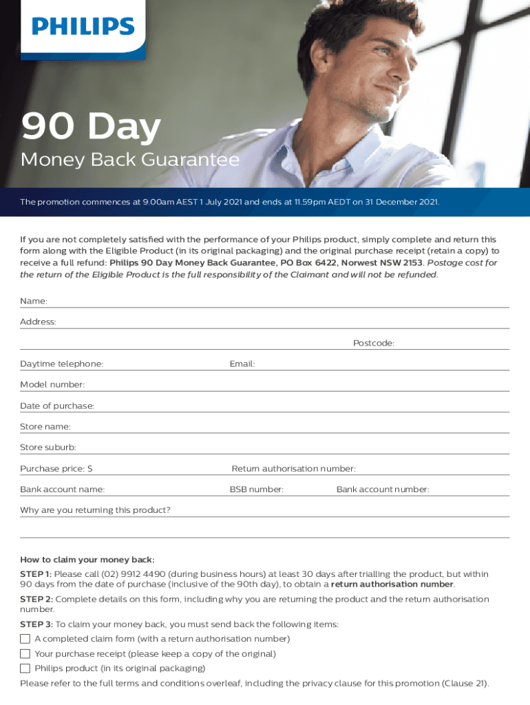 90-Day Money-Back Guarantee The promotion commences at 9.00am AEST 1 July 2021 and ends at 11.59pm ADT on 31 December 2021. If you are not completely satisfied with the performance of your Philips