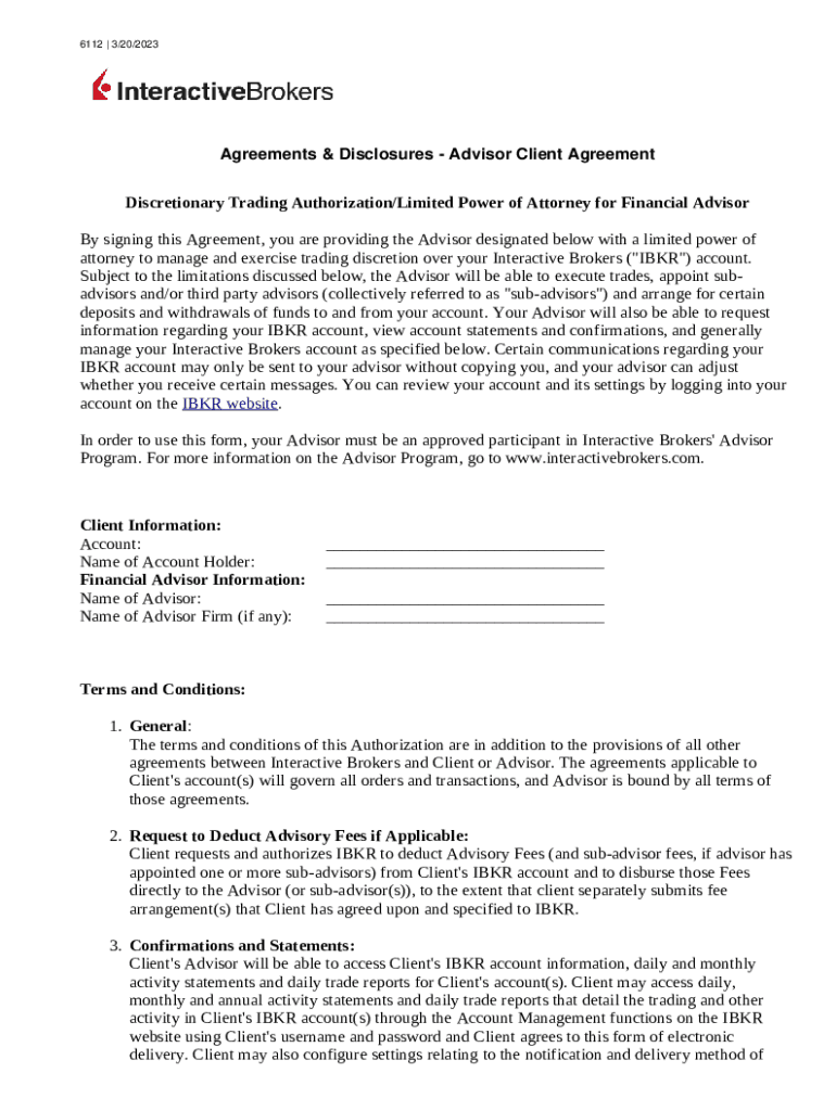 6112 | 3/20/2023Agreements & Disclosures Advisor Client Agreement Discretionary Trading Authorization/Limited Power of Attorney for Financial Advisor By signing this Agreement, you are providing the