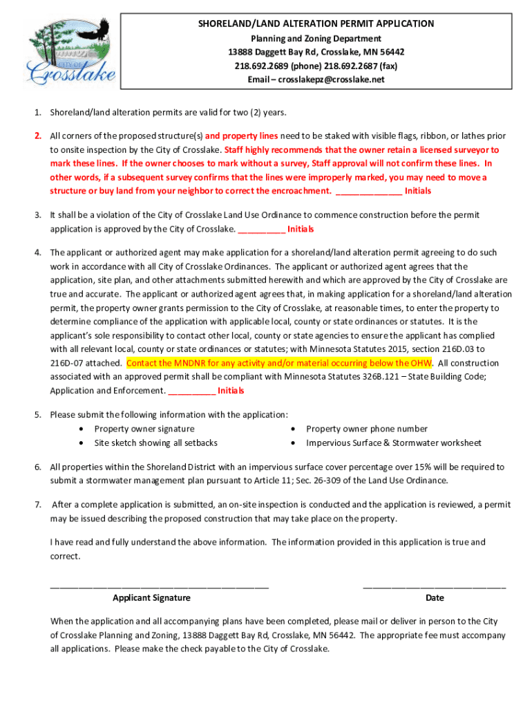 Forms permits and applicationscrosslake can typically be filled out online or obtained from the Crosslake office, and must be completed with accurate and detailed information regarding the activity or development being proposed.
