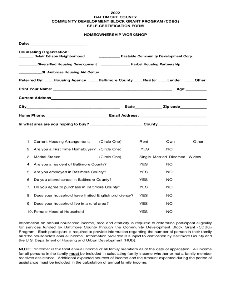 2022 BALTIMORE COUNTY COMMUNITY DEVELOPMENT BLOCK GRANT PROGRAM (CBG) RECERTIFICATION FORM HOMEOWNERSHIP WORKSHOP Date: ___ Counseling Organization: Belief Edison Neighborhood ___Diversified Housing