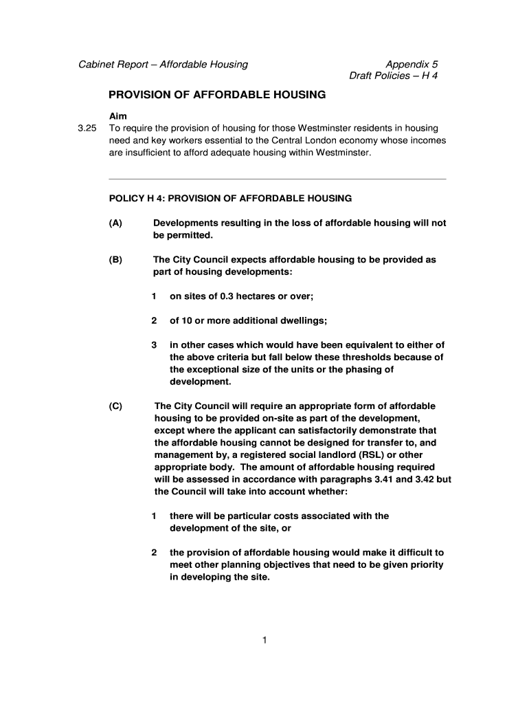 Cabinet Report Affordable Housing Appendix 5 Draft Policies H 4 PROVISION OF AFFORDABLE HOUSING 3.25 Aim To require the provision of housing for those Westminster residents in housing need and key