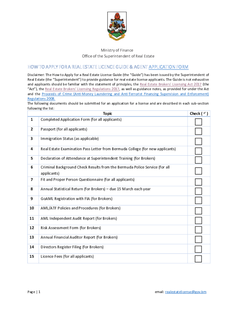 Ministry of Finance Office of the Superintendent of Real Estate TO APPLY FOR A REAL ESTATE License GUIDE & AGENT APPLICATION FORM Disclaimer: The How to Apply for a Real Estate License Guide (the