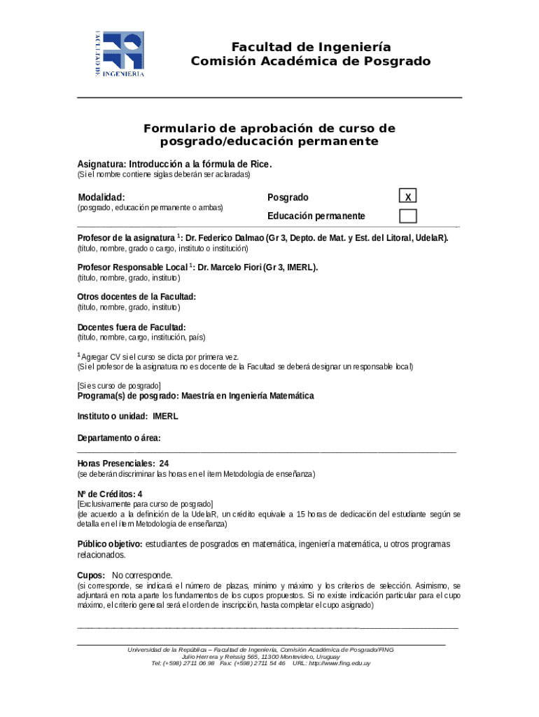 Facultad de Ingeniera Cousin Academic de PosgradoFormulario de probation DE curs ode postgrad/education permanent Signature: Introduction à la formula de Rice. (Si El hombre contains Silas Webern