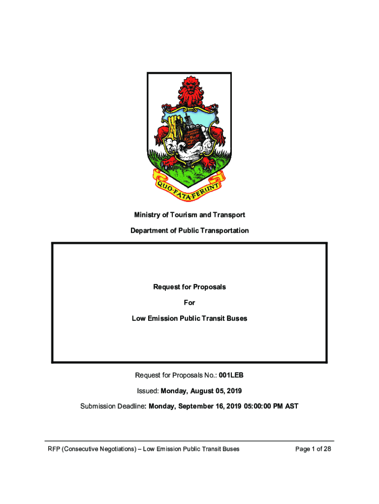 Ministry of Tourism and Transport Department of Public TransportationRequest for Proposals For Low Emission Public Transit BusesRequest for Proposals No.: 001LEB Issued: Monday, August 05, 2019, Submission