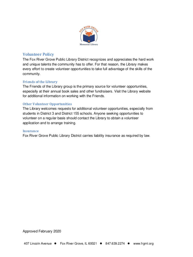 Volunteer Policy The Fox River Grove Public Library District recognizes and appreciates the hard work and unique talents the community has to offer. For that reason, the Library makes every effort