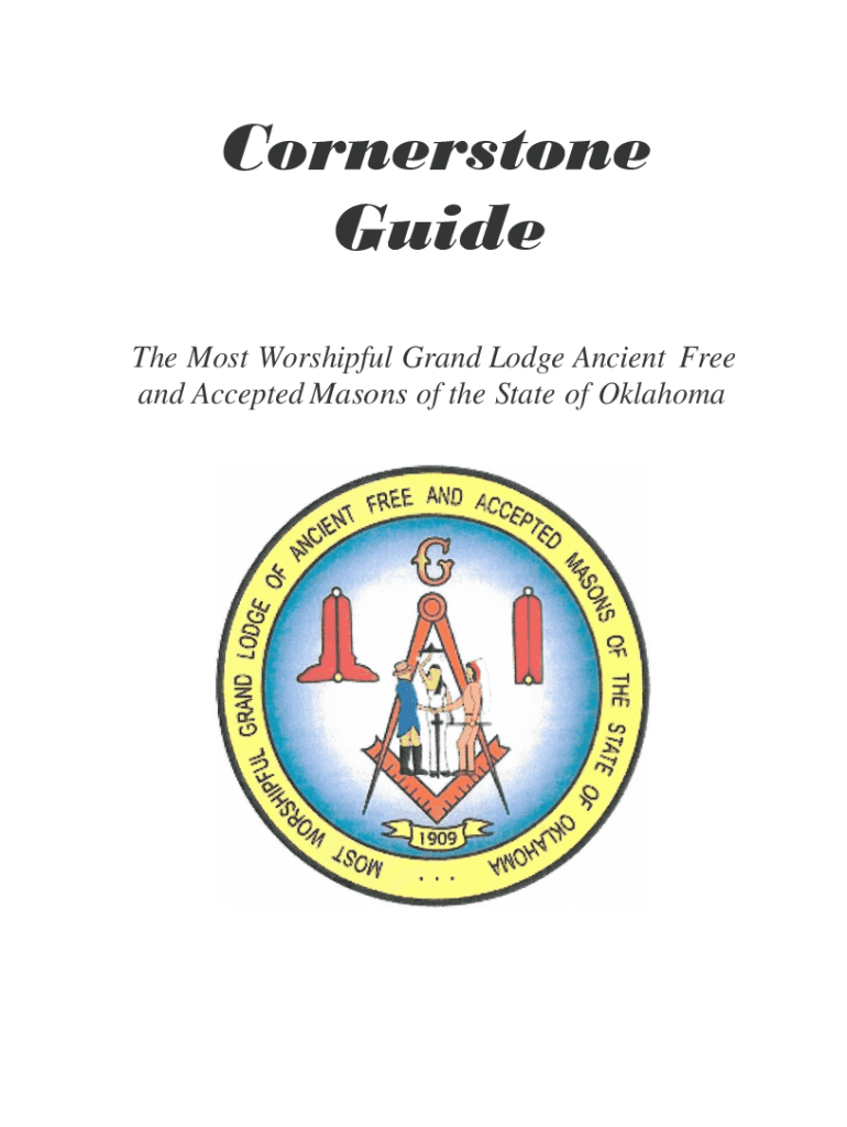 Cornerstone Guide The Most Worshipful Grand Lodge Ancient Free and Accepted Masons of the State of Oklahoma Ceremony of Laying a Cornerstone The ceremony of laying a cornerstone is distinctly a Grand