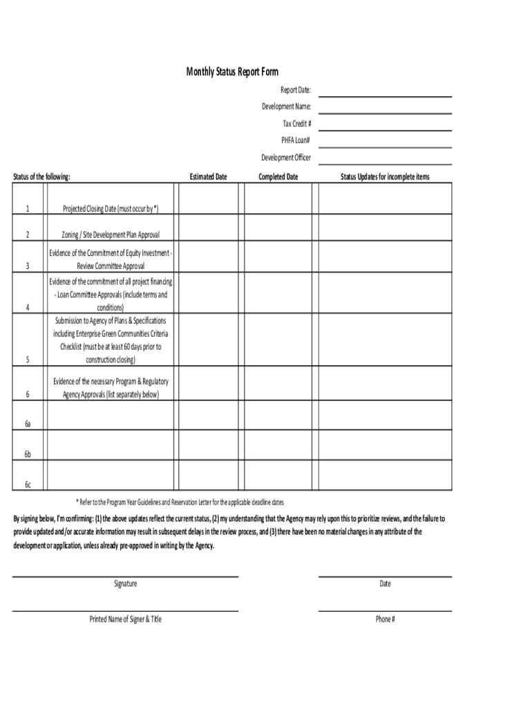 Monthly Status Report Form Report Date: Development Name: Tax Credit # PFA Loan# Development Officer Status of the following:Estimated Date1Projected Closing Date (must occur by *)2Zoning / Site Development
